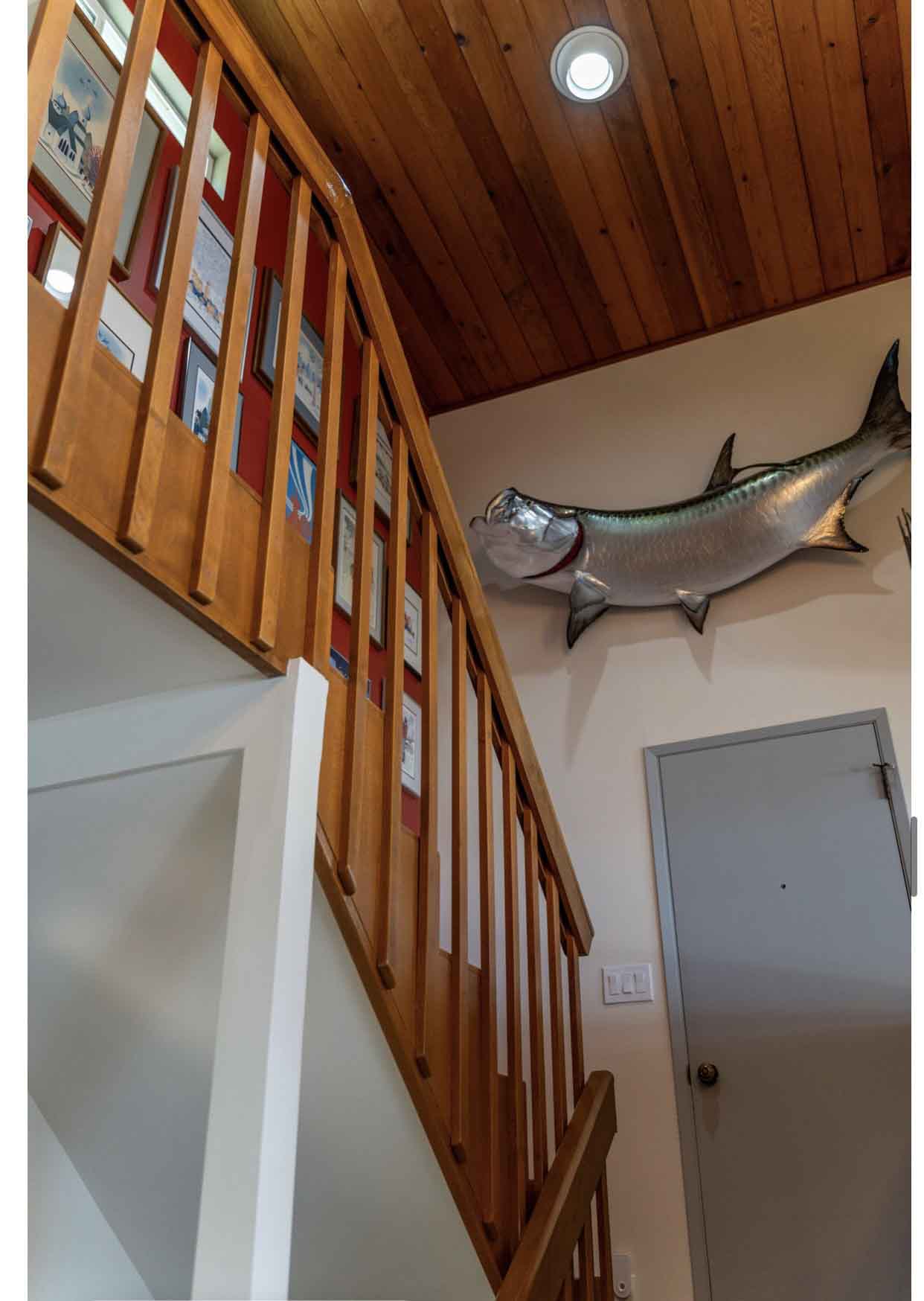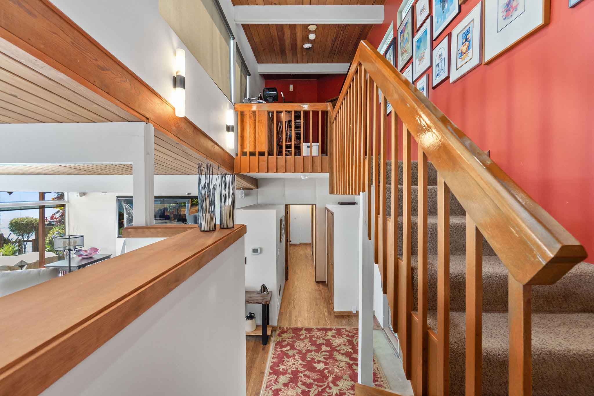 For this project, we fully refinished the kitchen cabinets, doors, trim, railings, and built-in shelving by stripping everything down to bare wood before applying a rich new stain and three coats of clear varnish. Each coat was sanded in between to achieve a smooth, durable, furniture-grade finish that revitalized the space.
